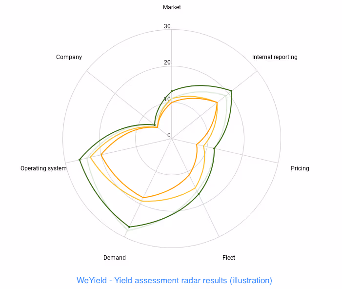 At the end of these two phases, the WeYield Learning Center team produces a mapping of the company's Yield knowledge. The chosen form is the radar map with 7 axes: pricing, market and competitors, information system, fleet, demand and reporting and the company. Two curves per collaborator are displayed: one concerns the self-assessment and the other the correction made after the consultant's review.