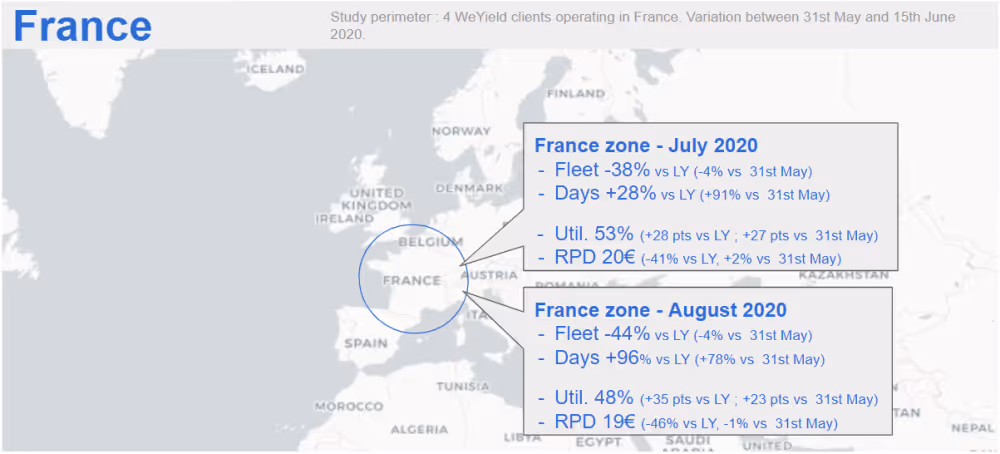 France shows very strong days growth as demand is returning and strong utilisation growth as a result of recent fleet cuts.